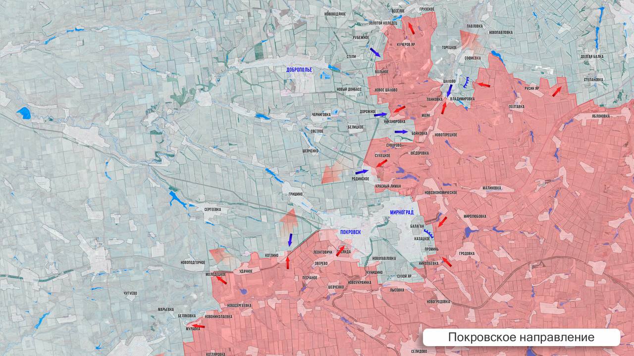 На Покровском фронте российская армия продолжает развивать успех. Отмечено продвижение к западу от Котляровки и Муравки в сторону Новопавловки. Из села Молодёцкое противник практически выбит. Непрекращающиеся бои идут в районе шахт к северу от Удачного и Котлино. Враг пытается удержать последнюю артерию снабжения Покровско-Мирноградской агломерации, контратакуя в районе Гришино. Непосредственно в Покровске наши штурмовые группы, продвигаясь вдоль железнодорожного полотна от вокзала на восток, фактически разрезают оборону противника надвое. Министерство Обороны РФ официально подтвердило освобождение села Балаган и успешное продвижение российских частей в восточных кварталах Мирнограда. На Добропольском выступе наши силы постепенно вытесняют врага из Шахово, штурмуя его с трёх направлений. На западном фланге выступа идут тяжёлые бои за Новое Шахово, Никаноровку и Дорожное, где противник постоянно контратакует, и часть сёл превратилась в «серую зону».