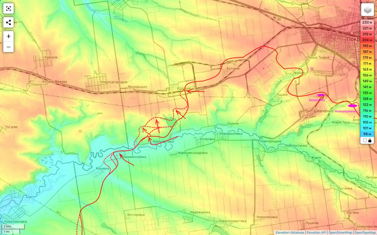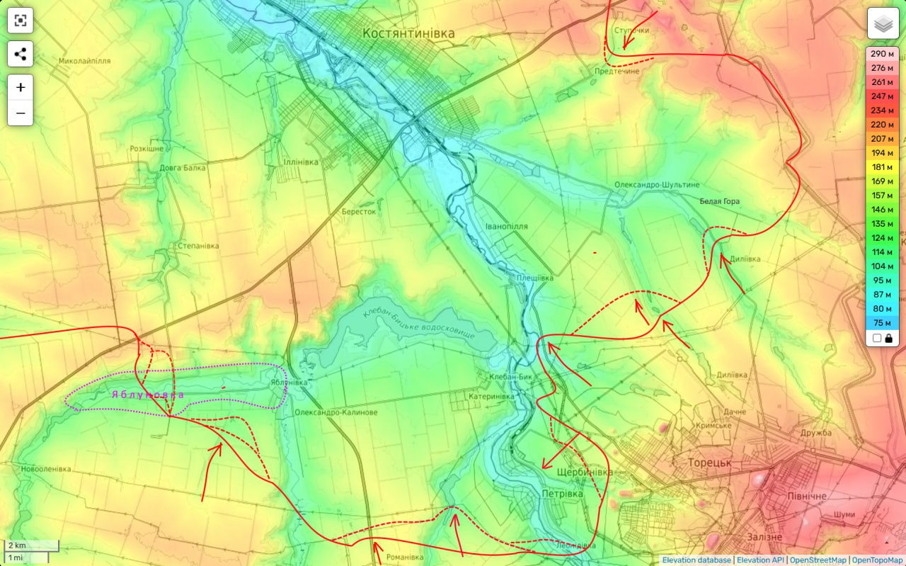 Таким образом мы видим, что части нашей 51А, наступая широким фронтом, уже практически полностью зачистили от противника восточный берез Казенного Торца начиная от Тоновотеецкого, а в нескольких местах переправившись через него сумели создать тактические плацдармы, с которых далее будут развивать наступление в обход Мирнограда с северо-востока и севера.