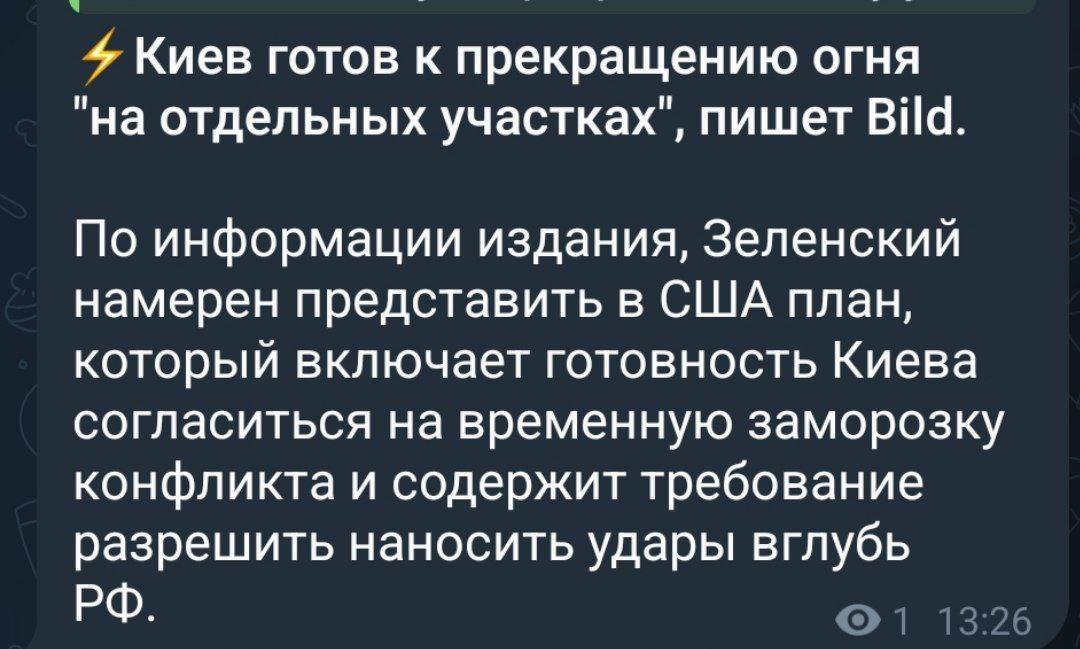Вот новые удивительные истории про переговоры. Теперь якобы Зеленский готов на заморозку конфликта (как хочет трамп), но хочет разрешение США на удары в глубь России. Источник новости странный, но сама постановка вопроса меня удивила — это как, заморозить конфликт, но бить в глубину страны? Но если конфликт замораживается, куда они бить собрались? Или это попытка уйти с поле боя, где дела неочень?