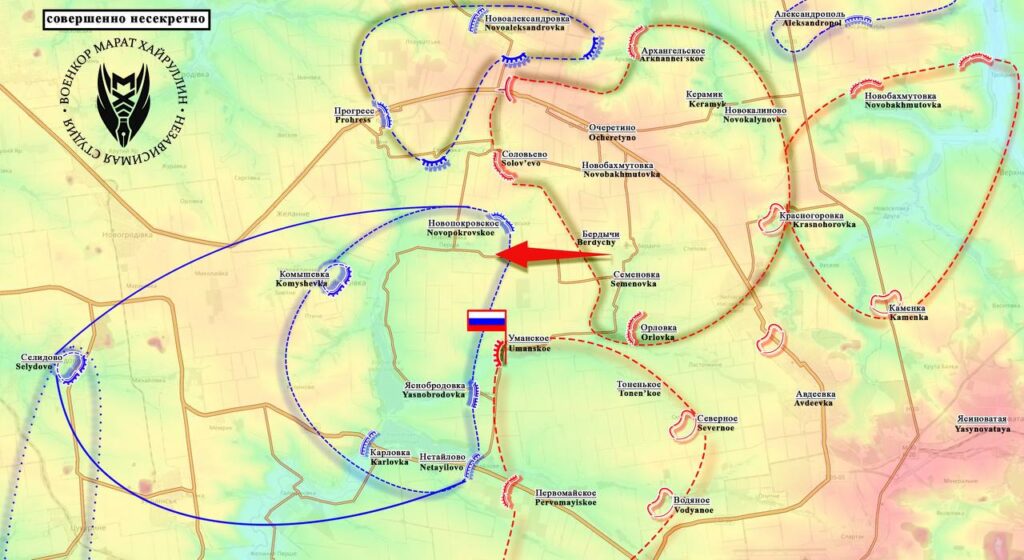На Донецком направлении ВС РФ установили полный контроль над населëнным пунктом Уманское, в центре которого 9-го мая был водружен флаг. Также был установлен контроль над дорогой и полями южнее него почти до н.п. Нетайлово.