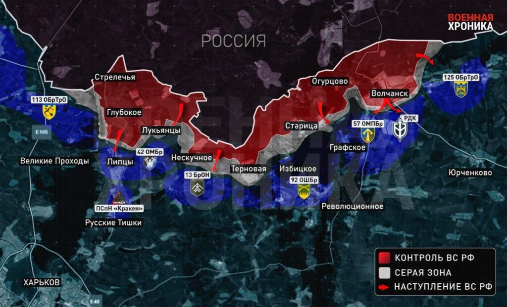 Куда продвинулись войска? С пяти изначальных направлений количество участков, где войска группировки «Север» смогли быстро продвинуться и освободить ранее занятые ВСУ территории, увеличилось до семи. Наибольшего прогресса удалось добиться по линии Глубокое — Липцы, Лукьянцы — Весёлое, Огурцово — Старица и в районе Волчанска, который ВСУ оставили во избежание окружения. Спрямление линии фронта, последовавшее за серией тактических успехов, позволило выделить два основных направления удара: Липцы — Харьков и Волчанск — Белый Колодезь. В сторону Харькова под огневой контроль постепенно берутся пути снабжения гарнизона ВСУ в городе, что косвенно говорит о подготовке реализации артёмовского сценария с отсечением логистики и изоляцией района боевых действий. Непосредственно штурм города, вероятно, не будет проводиться вообще.