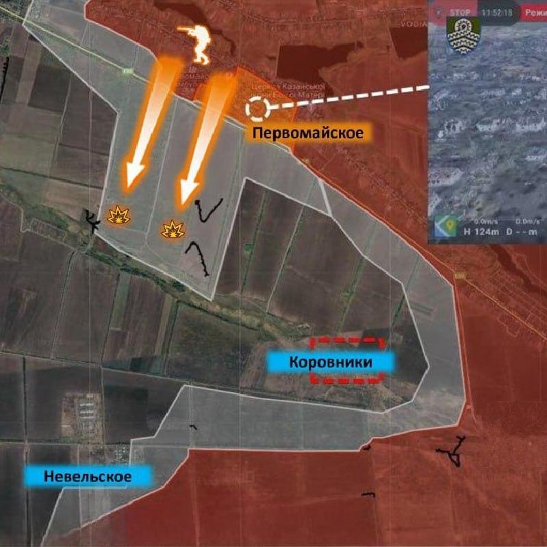 Севернее продолжаются бои на рубеже Первомайское — Невельское. В окрестностях балки Домаха наступила оперативная пауза, по-видимому, в связи со сложной минной обстановкой. При этом окончательное освобождение участка осложняется также активностью украинских БЛА.